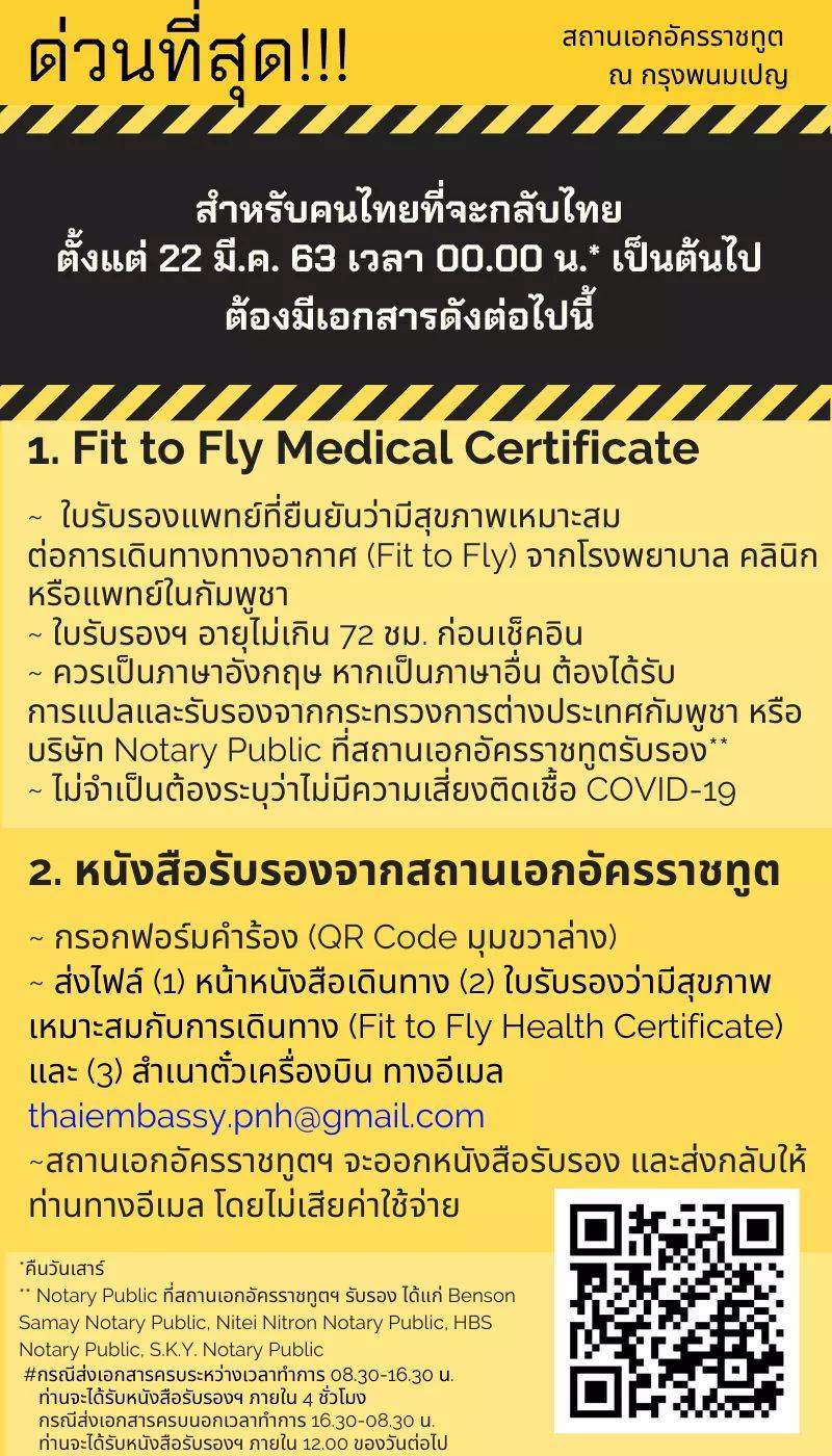 (1) ใบรับรองทางการแพทย์ “Fit to Fly” และ (2) หนังสือรับรองการเดินทางกลับประเทศไทยที่ออกโดยสถานเอกอัครราชทูต ณ กรุงย่างกุ้ง มีผลบังคับใช้ตั้งแต่ 21 มีนาคม 2563 เวลา 00.0 น. ตามเวลาประเทศไทย)